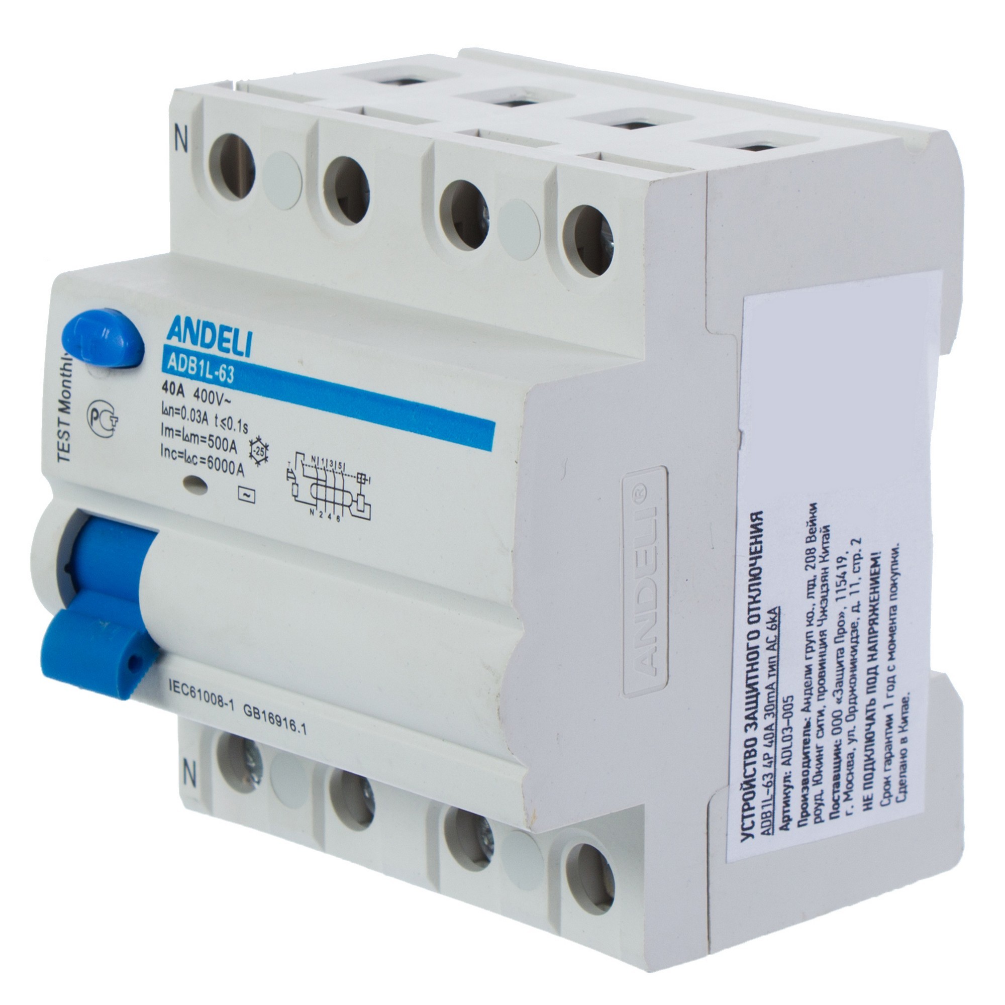 Устройства защитного отключения УЗО ADB1L-63 4P 40A 300mA тип AC 6kA предназначены для защиты человека от поражения электрическим током при прикосновении к открытой проводке или к электрооборудованию